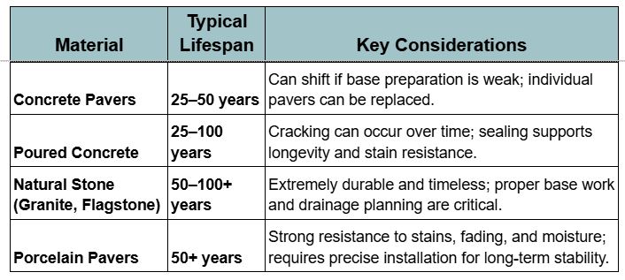Concrete surfaces can last many years with proper installation and sealing. Natural stone, such as granite or flagstone, often performs the longest. Porcelain pavers also offer strong durability due to their low water absorption and high surface strength.